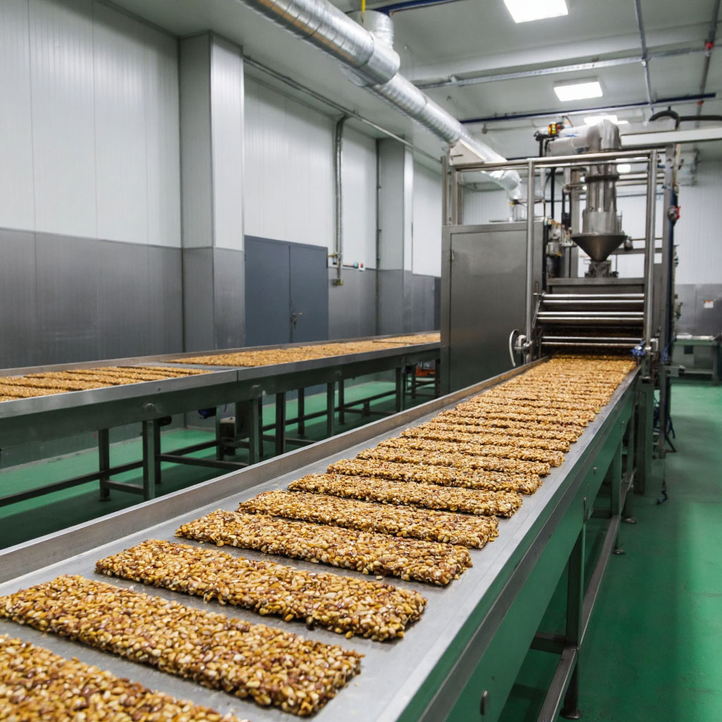 - Автоматическое оборудование для производства батончиков. В приемный бункер поступает еще не закристаллизованная смесь козинака и карамели (козиначное тесто). Козиначное тесто вытягивается валами и происходит формирование пласта. Далее пласт нарезается на заданные размеры.